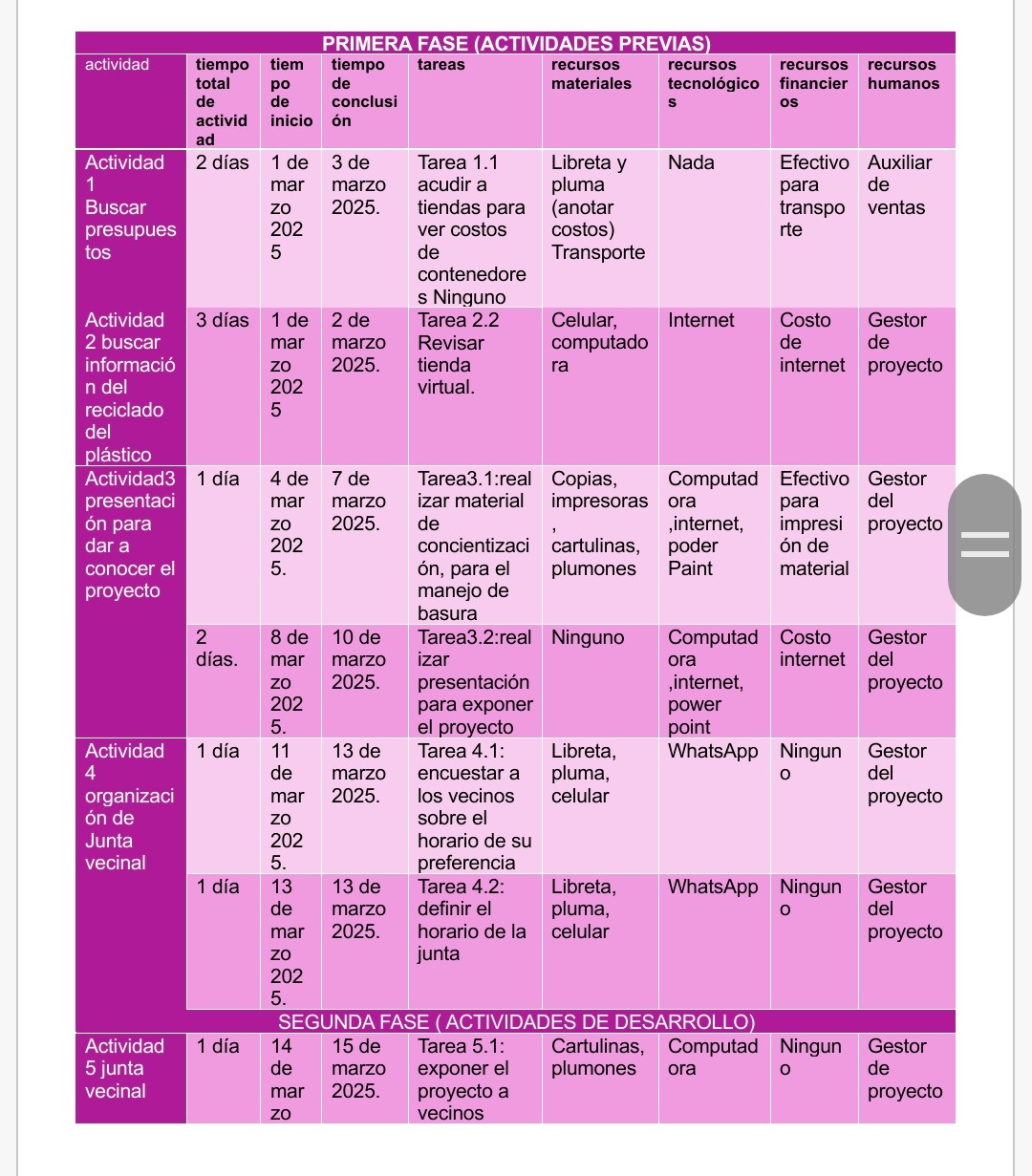 En esta fase se definen las acciones que se llevaran acabo para lograr que el proyecto se culmine en tiempo y forma , implementando un plan de acción que incluye:tabla de actividades, diagrama.